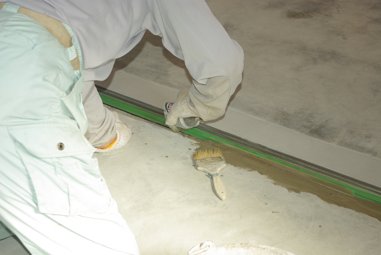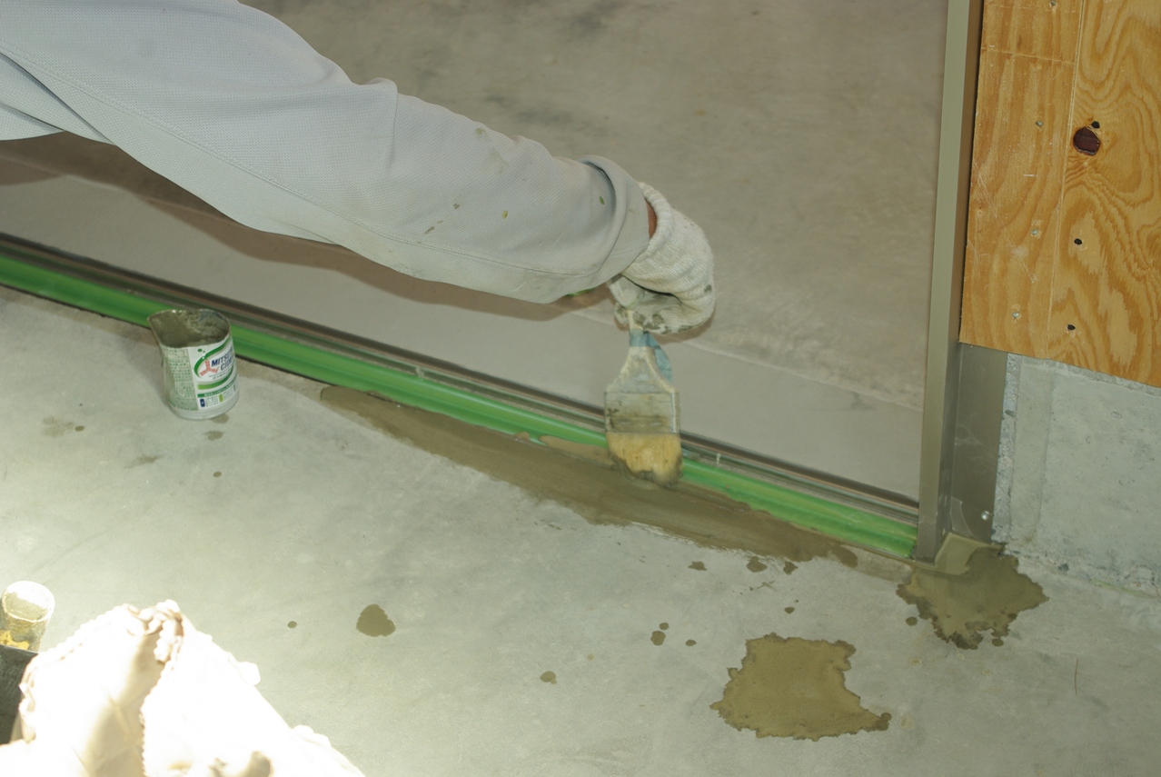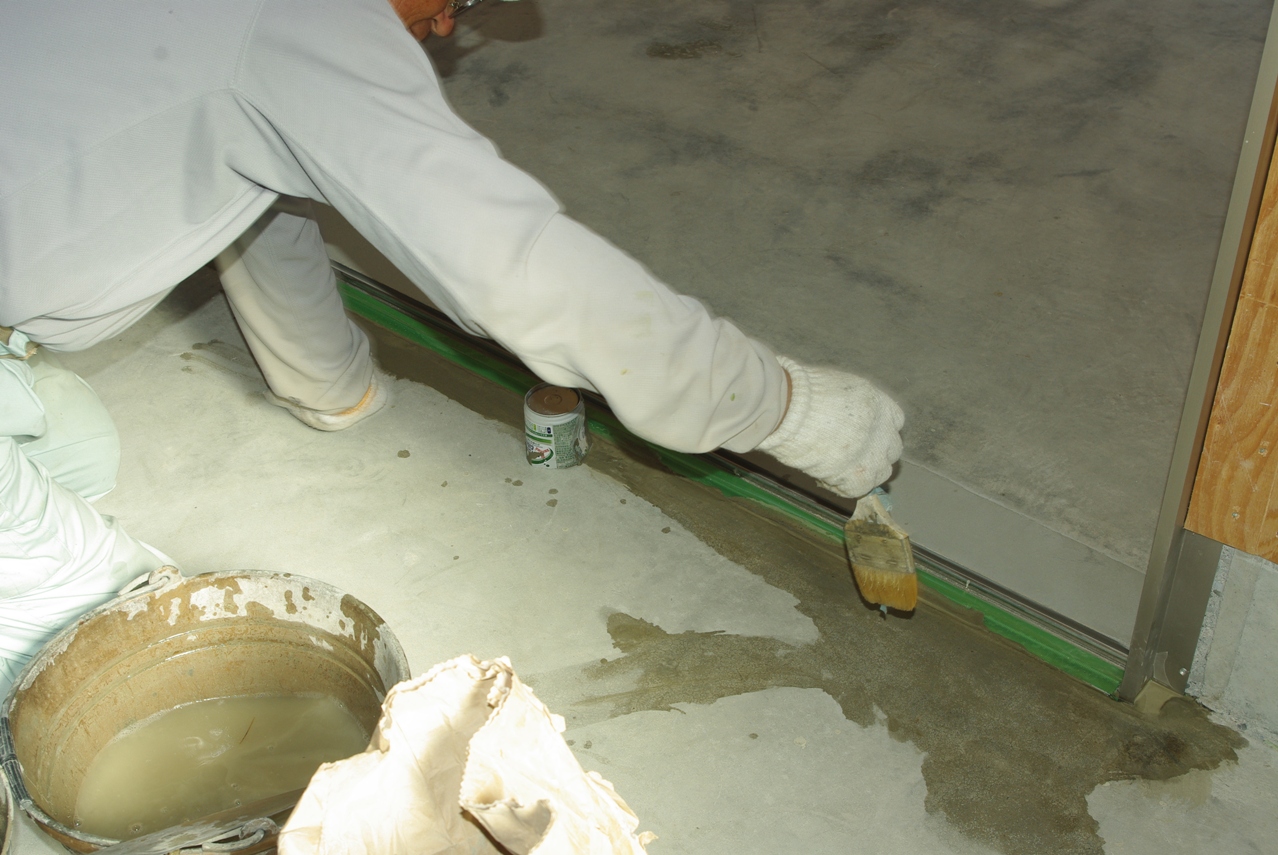 これはモルタルを流し込むときに、こぼれたりはみ出したモルタルがアルミサッシのレールを汚さないように、予めテープでマスキングをしています。