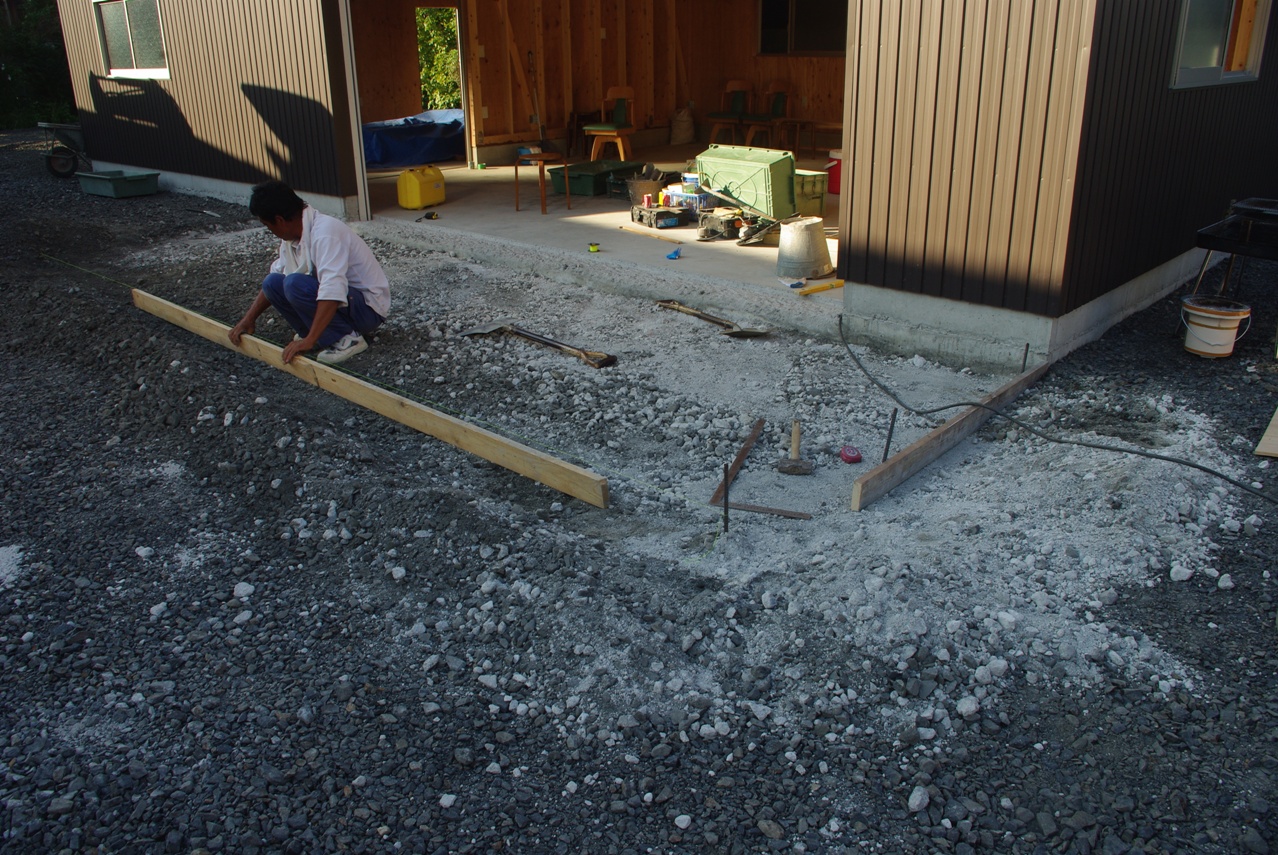 建物の東側の地面には、外構アプローチを施工するための型枠の資材(木材)が準備されていました。