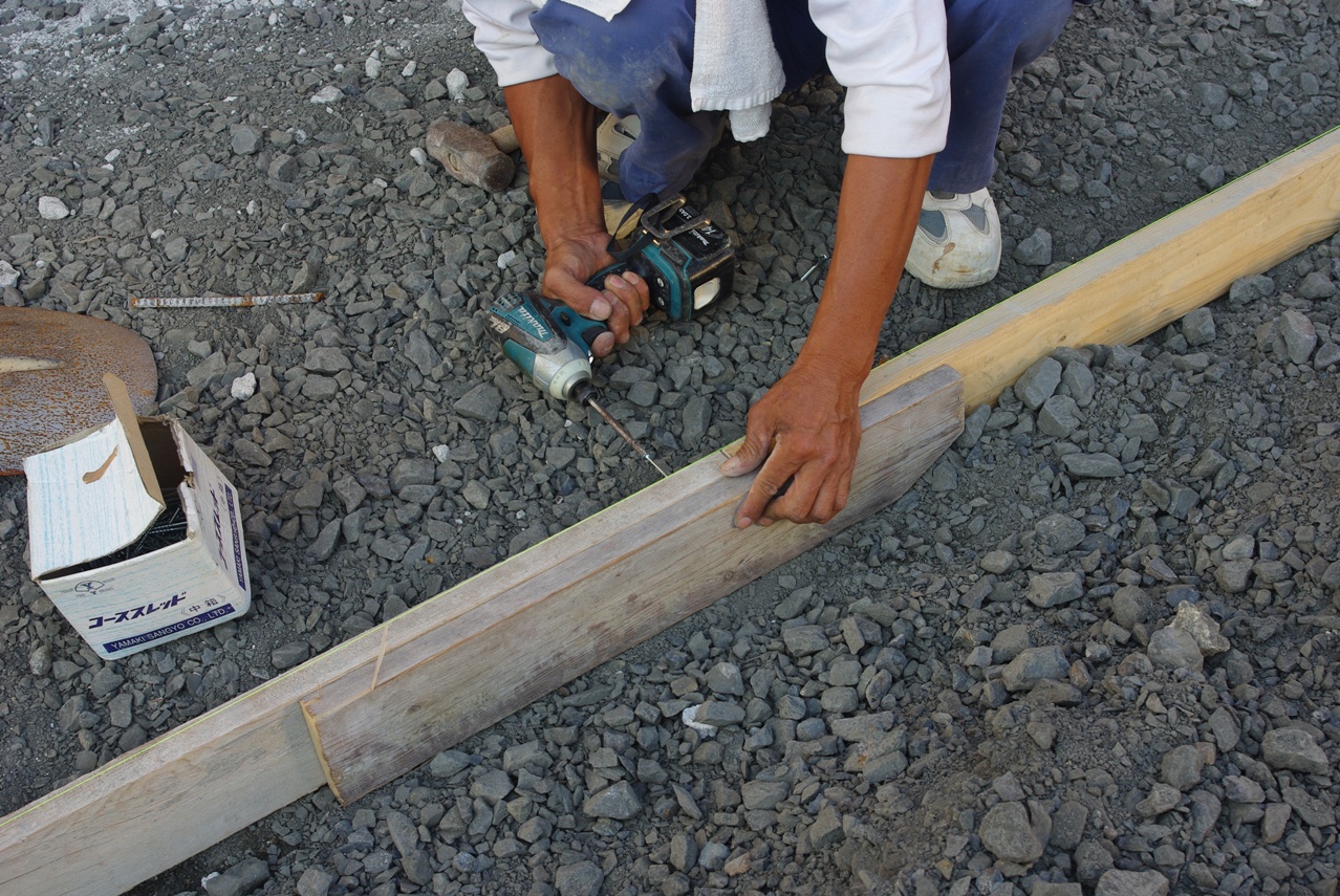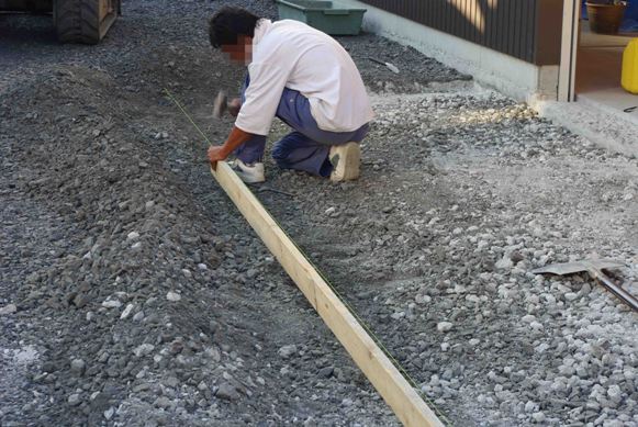 正確にレーザー水準器で測って予め張ってある基準の糸に合わせて、正確に型枠の板を設置していきます。