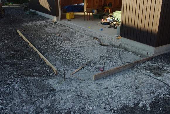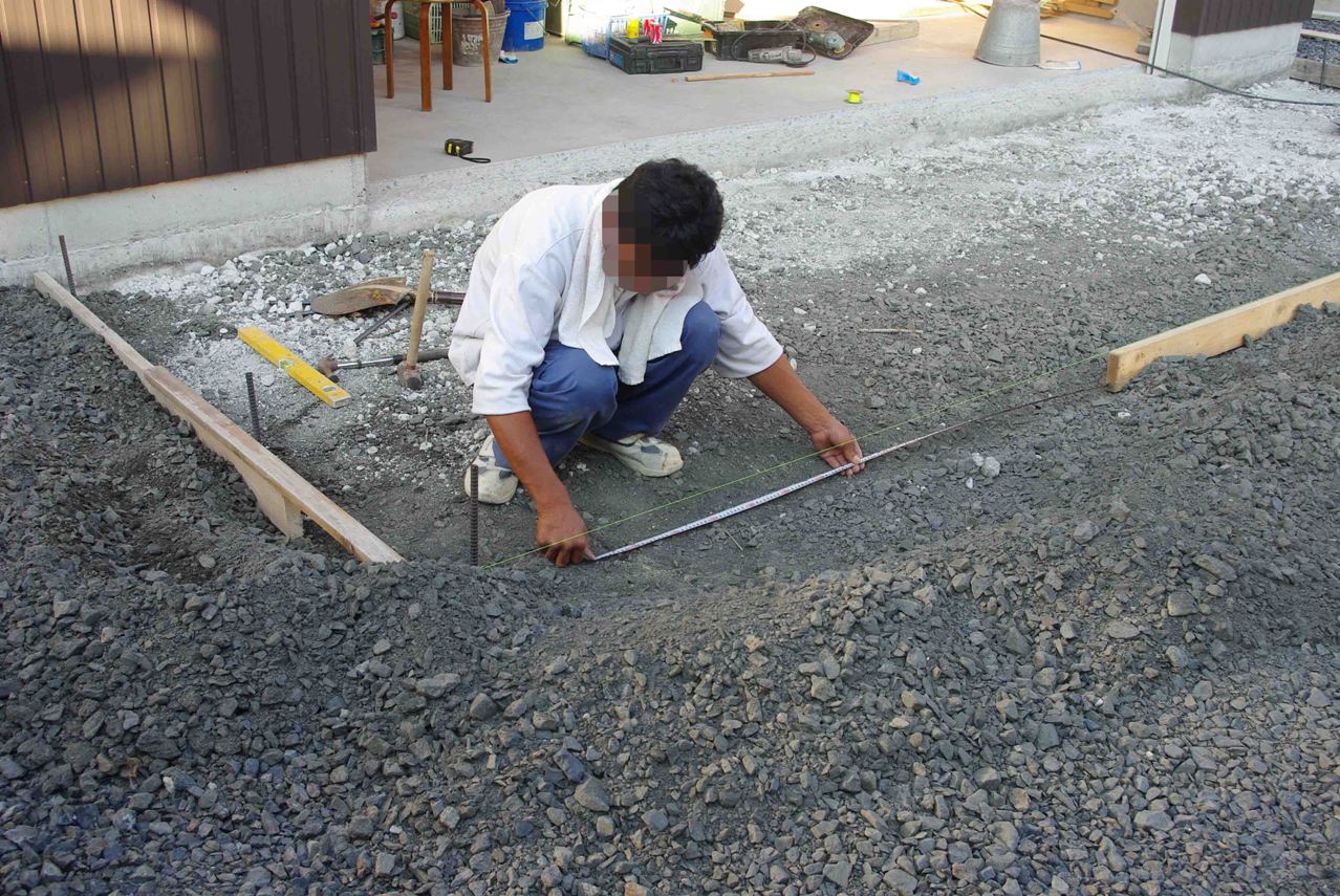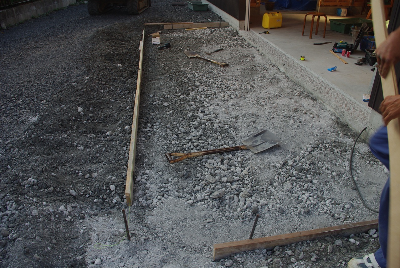 ガレージ西側敷地の整地が終了し、続いてガレージ入り口外構アプローチの型枠を設置する作業に取り掛かりました。