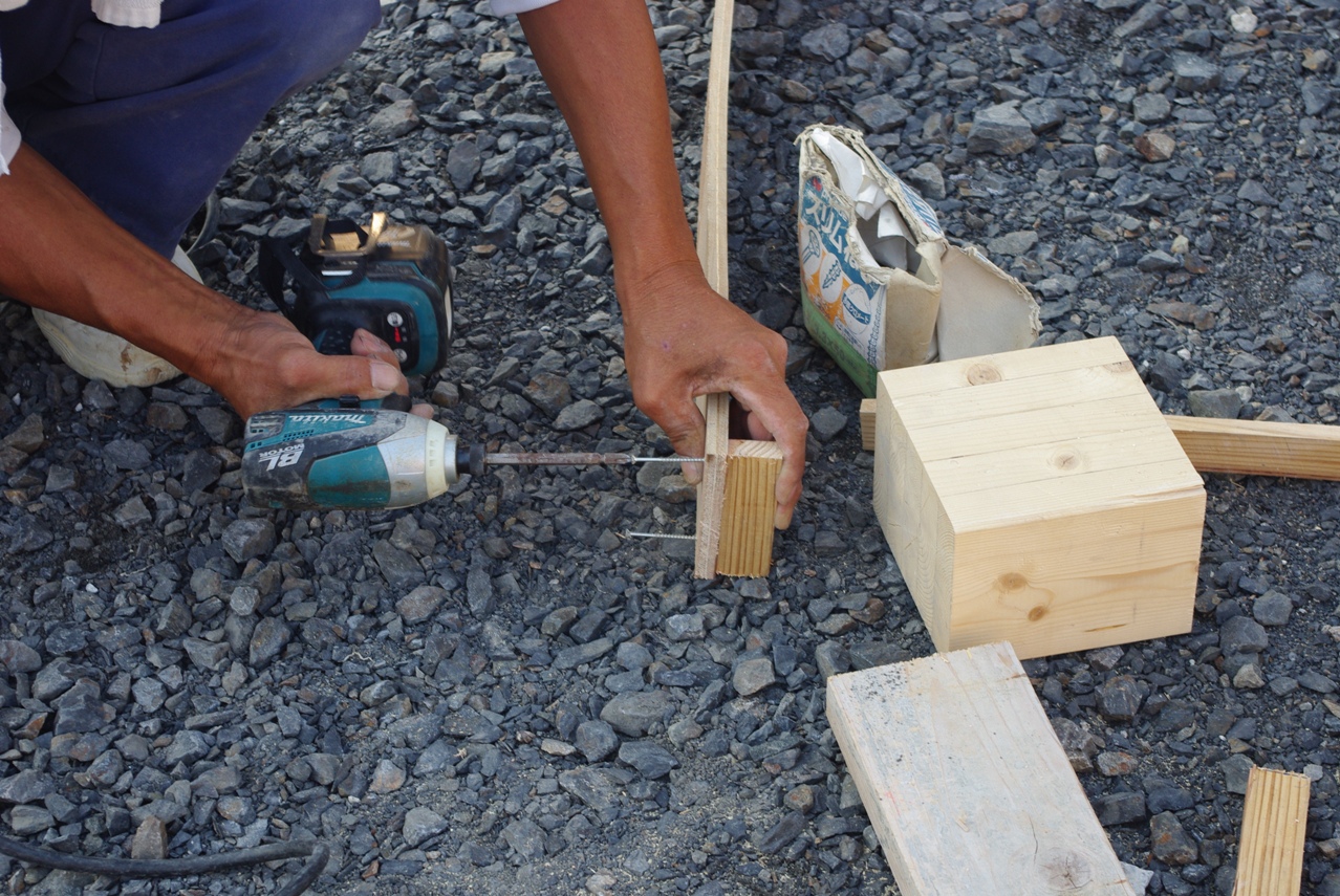 こんな感じで、先に設置した型枠に木ねじで接続固定出来るように足を付けました。