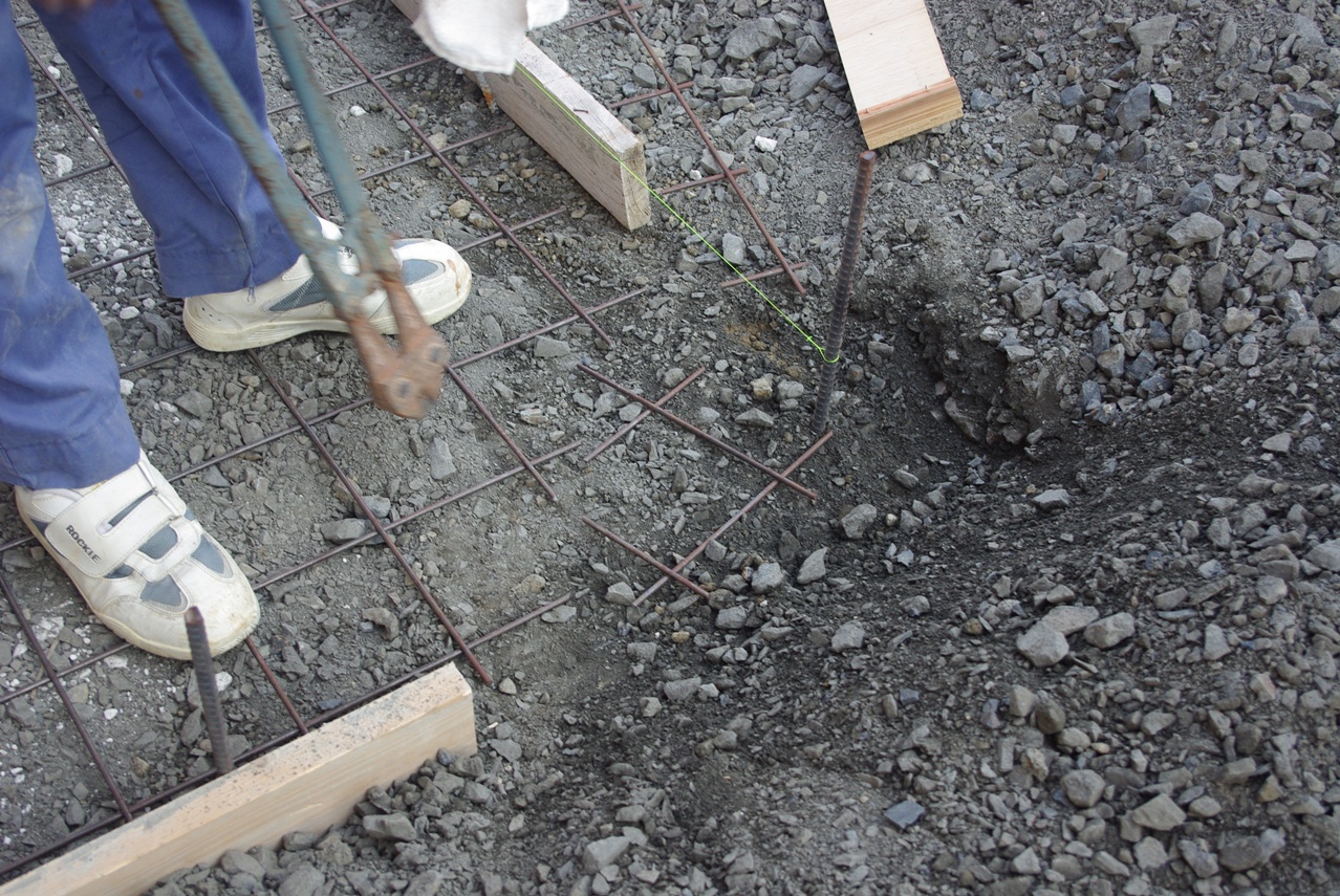 型枠を固定するために打ち込んだ鉄筋の杭の先端に、危険防止のキャップを取り付けました。