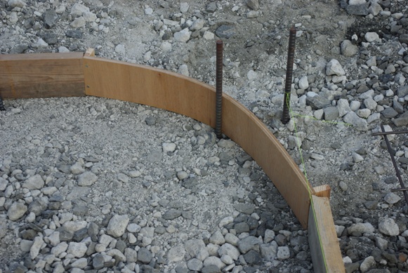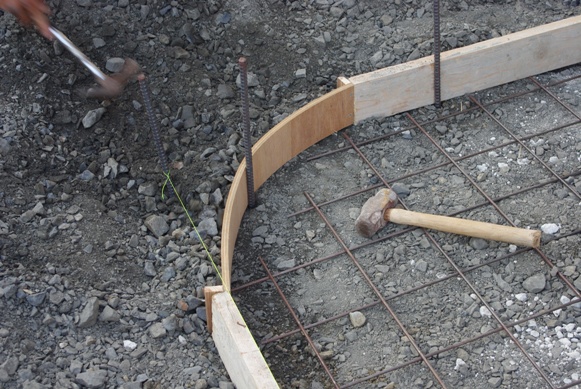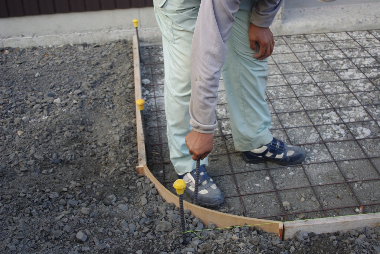 実際にはコンパネが厚すぎて、あまり小さいアールにならないので、一方の足を型枠に固定して、鉄筋の杭を先に打ってから、それを支点にしてかなり力を加えて曲げてから、半ば強引にもう一方の足を固定しています。