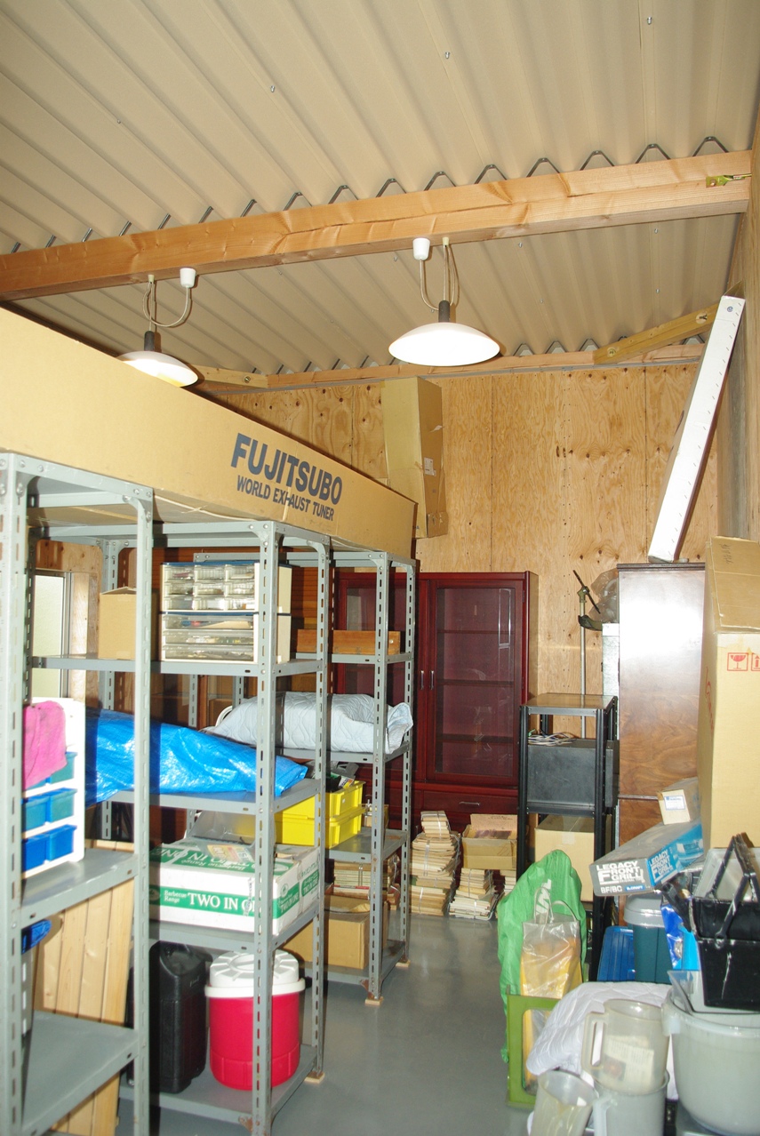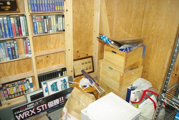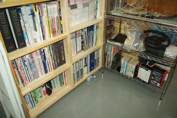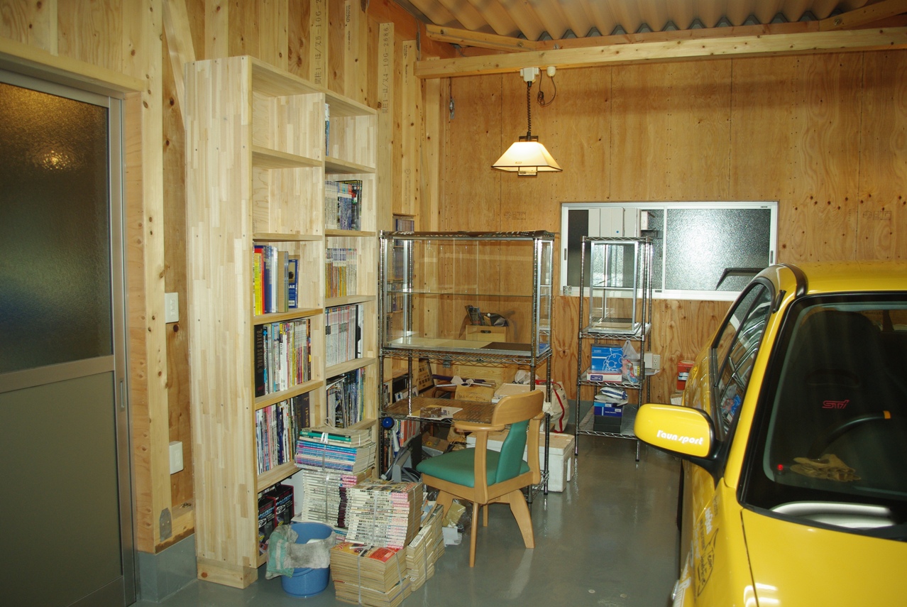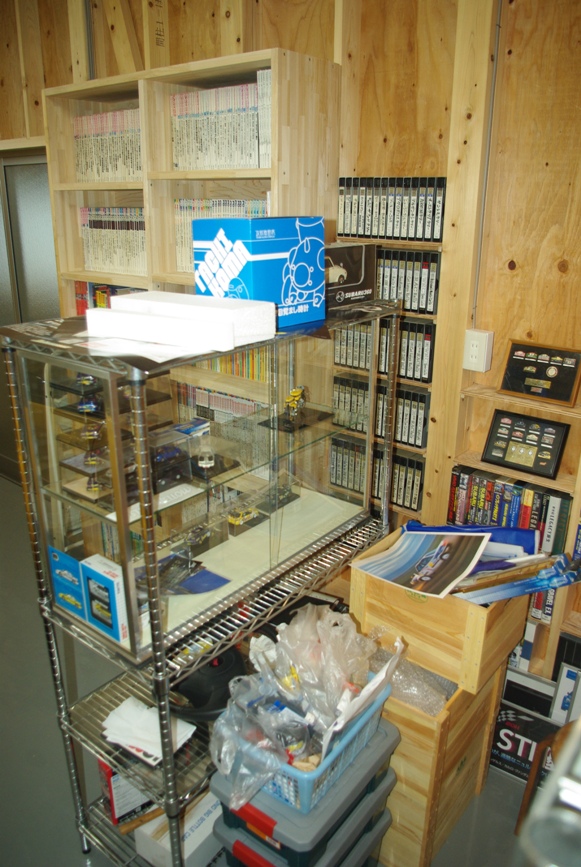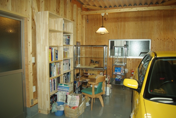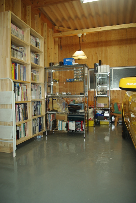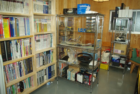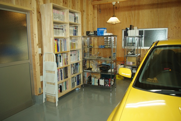 画面の左側に並んでいるスチール棚は、ガレージに建て替える前この場所に建っていた納屋で、私の車関係の工具や備品の格納用に使用していたものです。
