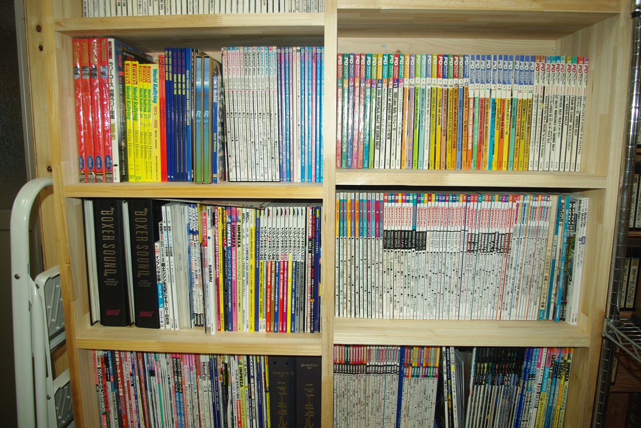 書棚の一番下の段、右側にはRALLY・Xpress誌が創刊号から揃っています。