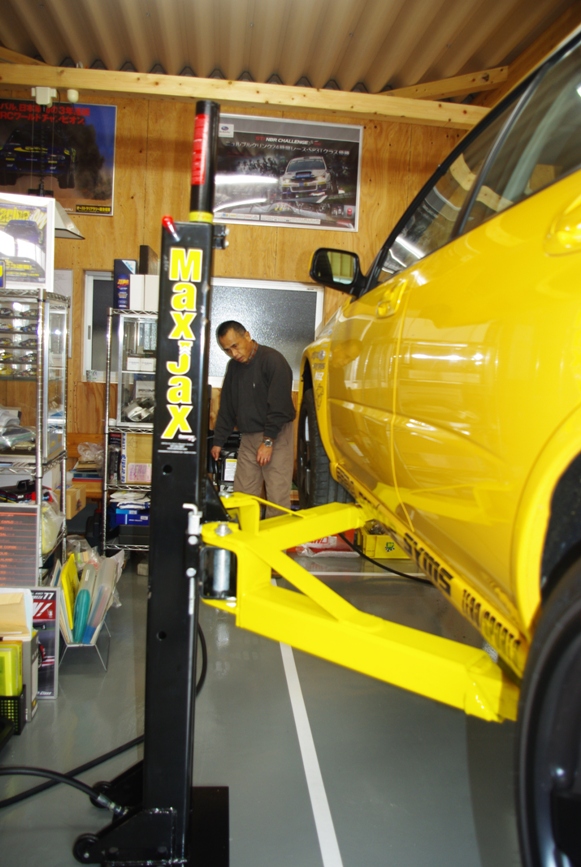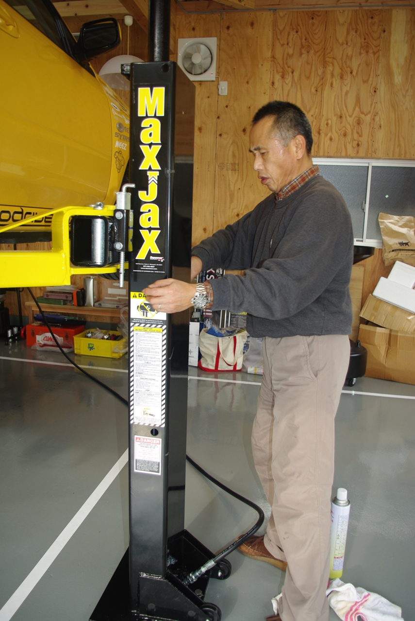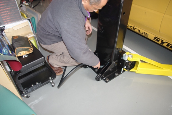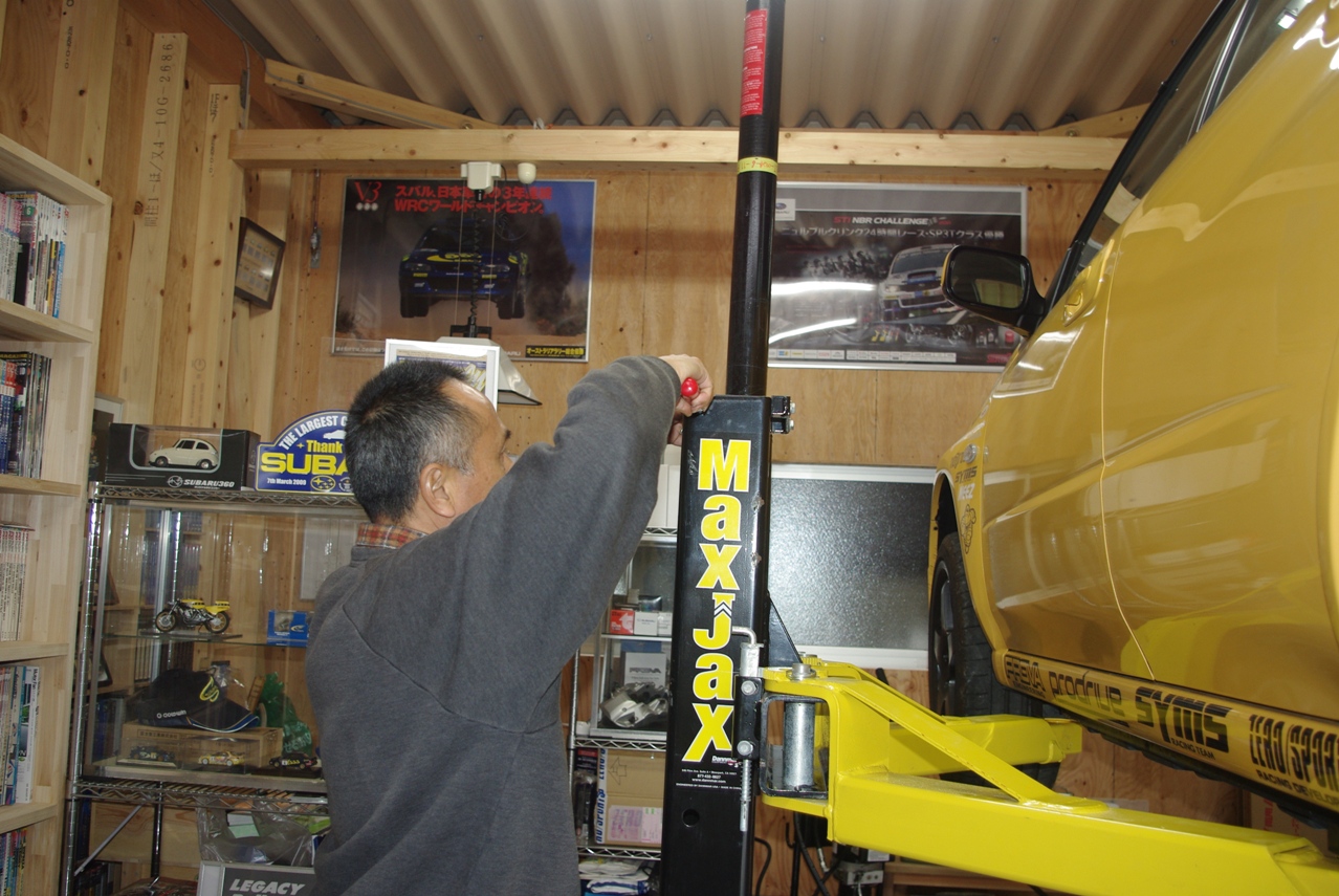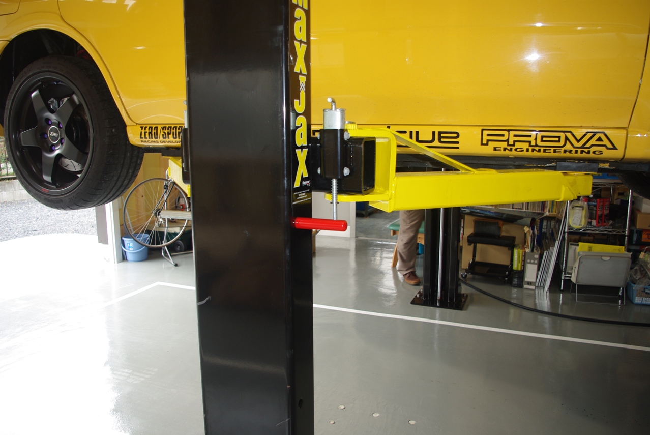 少しづつリフトアップして、ジャッキアップポイントに受け台がしっかりとフィットするよう位置を微調整をします。