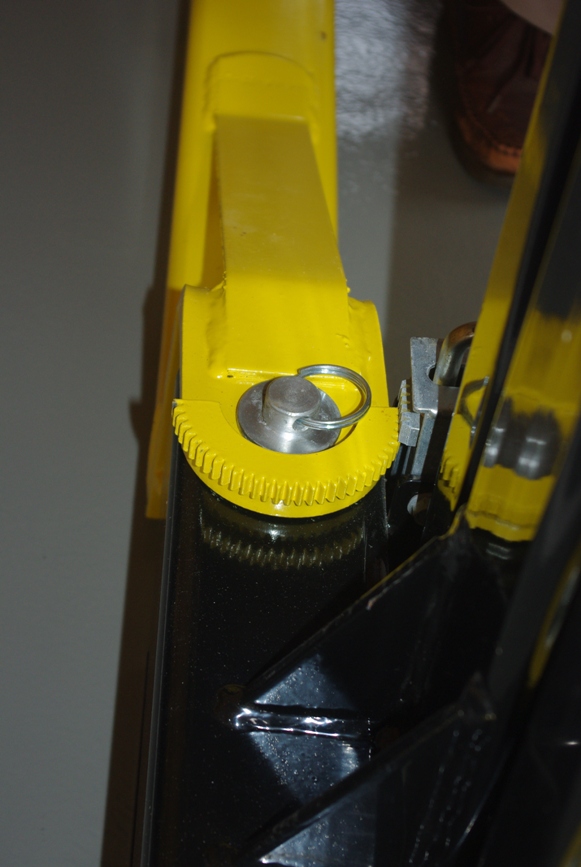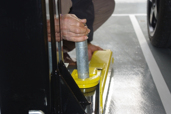 最上部までリフトアップしたら、ストップバーを差し込んで落下防止をします。