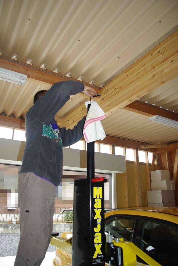 エンジンフードを開けたまま最大リフト量まで上げると、残念ながら開けたエンジンフードの最上部が天井大梁の下面に接触してしまいます。