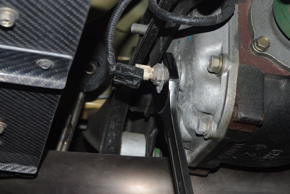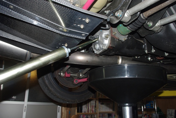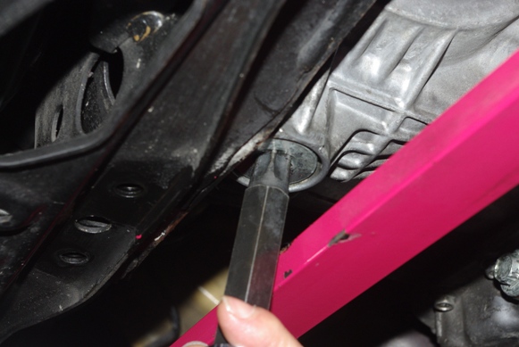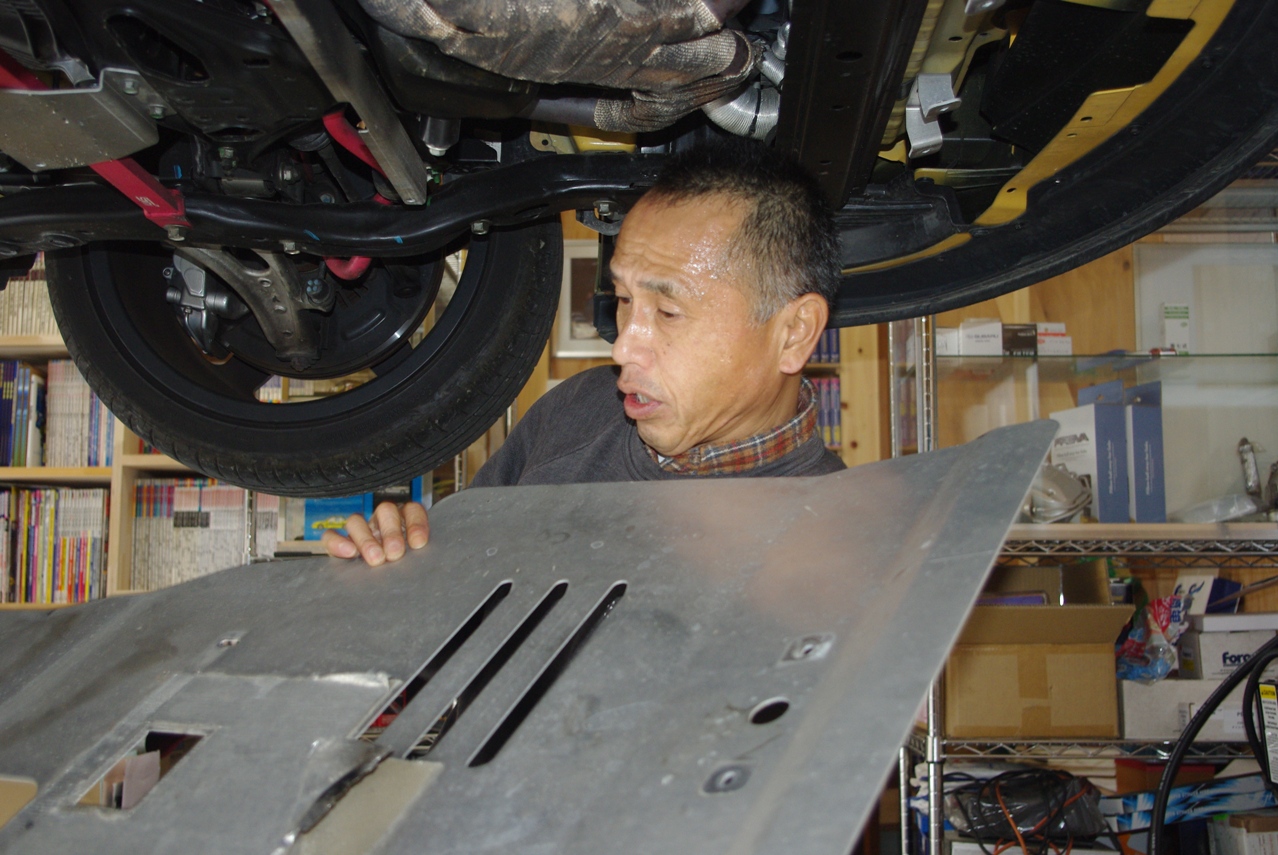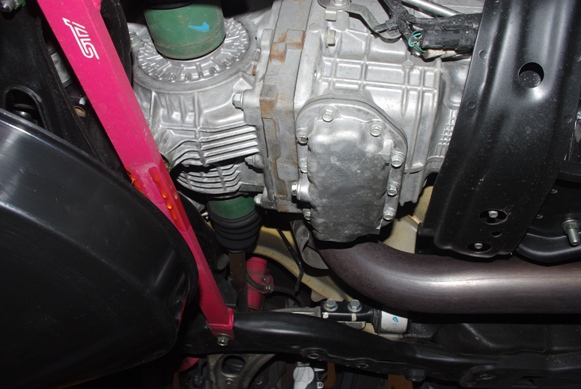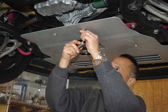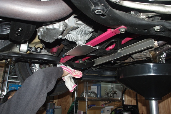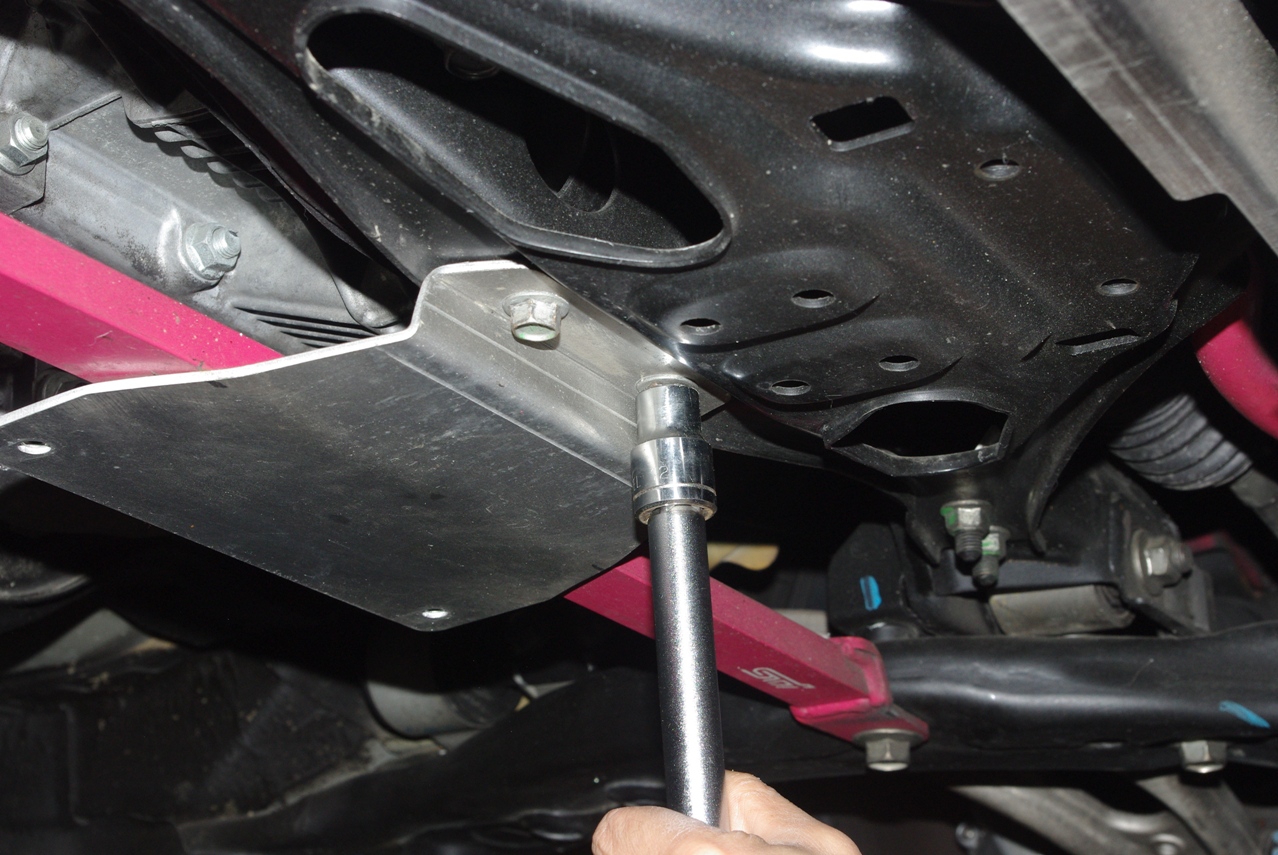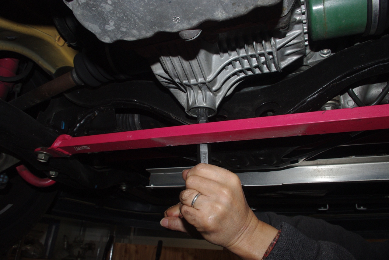 次にミッションオイルドレンプラグ(大)を取り外すのに邪魔になるため、フロントサポートバーに取り付けてあるアンダーパネル装着用のアルミ製ブラケットを取り外します。