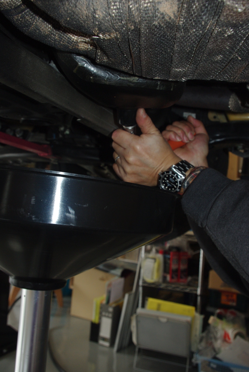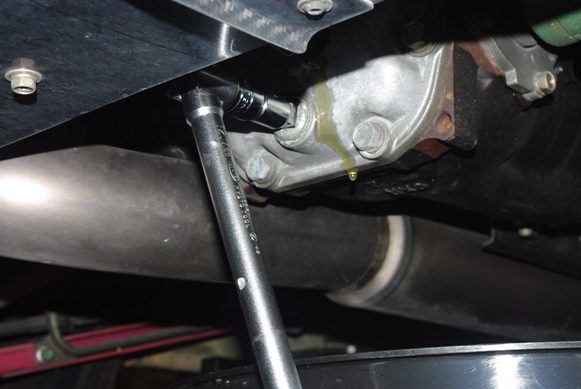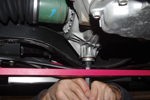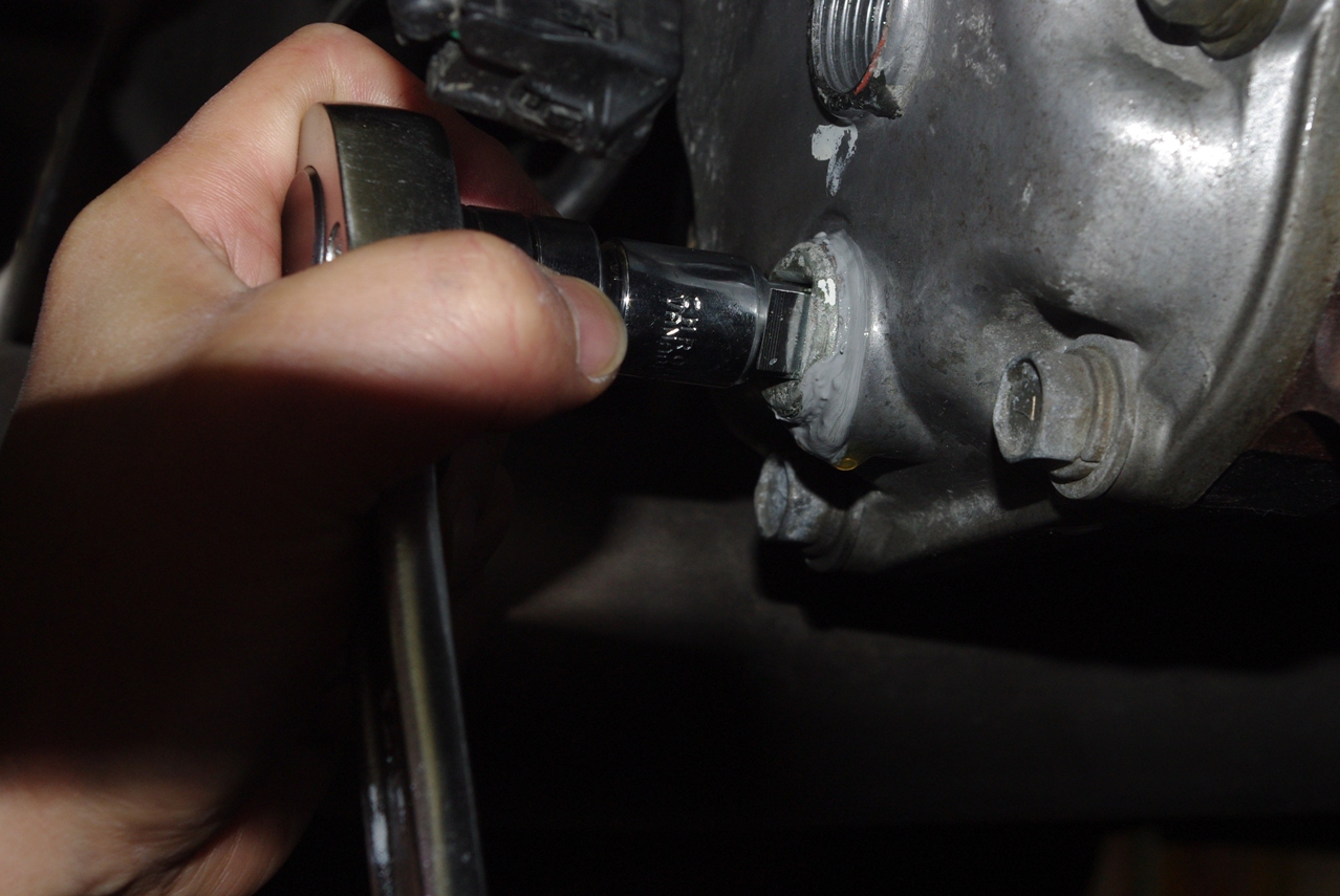 コチラは意外にも9.5o sq.のラチェットハンドルではトルク不足だったので、ドレンプラグソケットの9.5o sq.の差し込みをアダプターで12.7o sq.に変換して、よりトルクのかかるレンチで取り外しました。