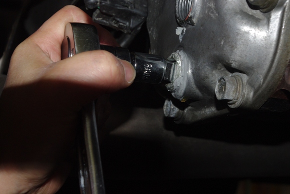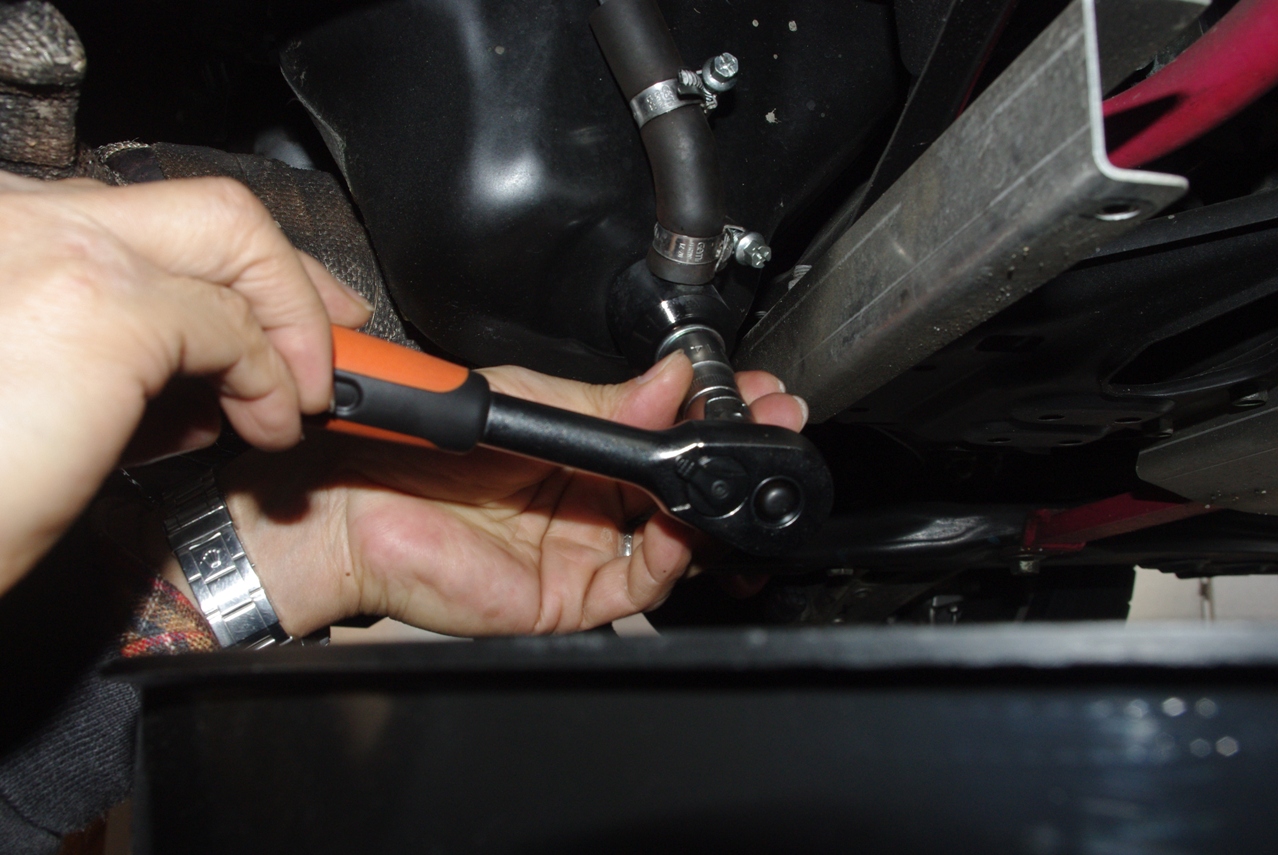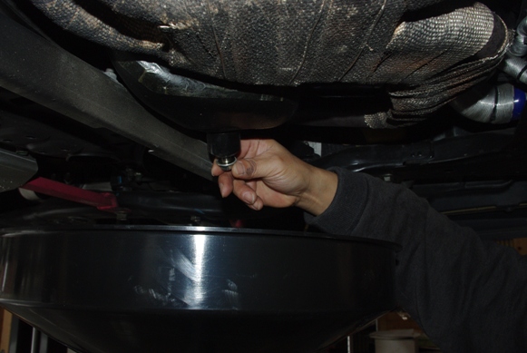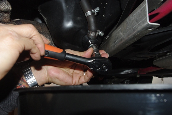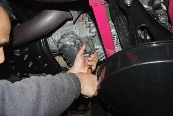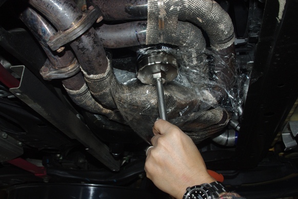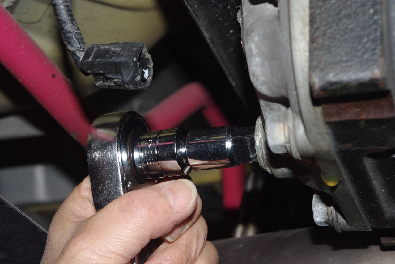 エンジンオイルドレンプラグを取り外すために、9.5o sq.ラチェットハンドルに14oのソケットプラグをセットしています。