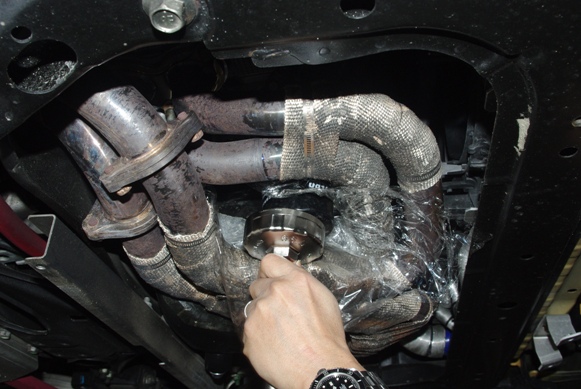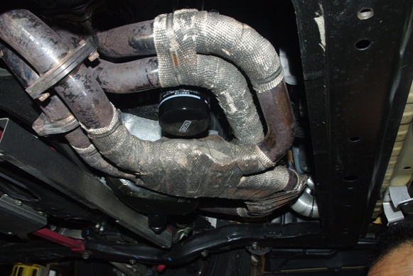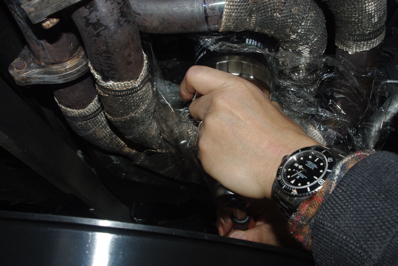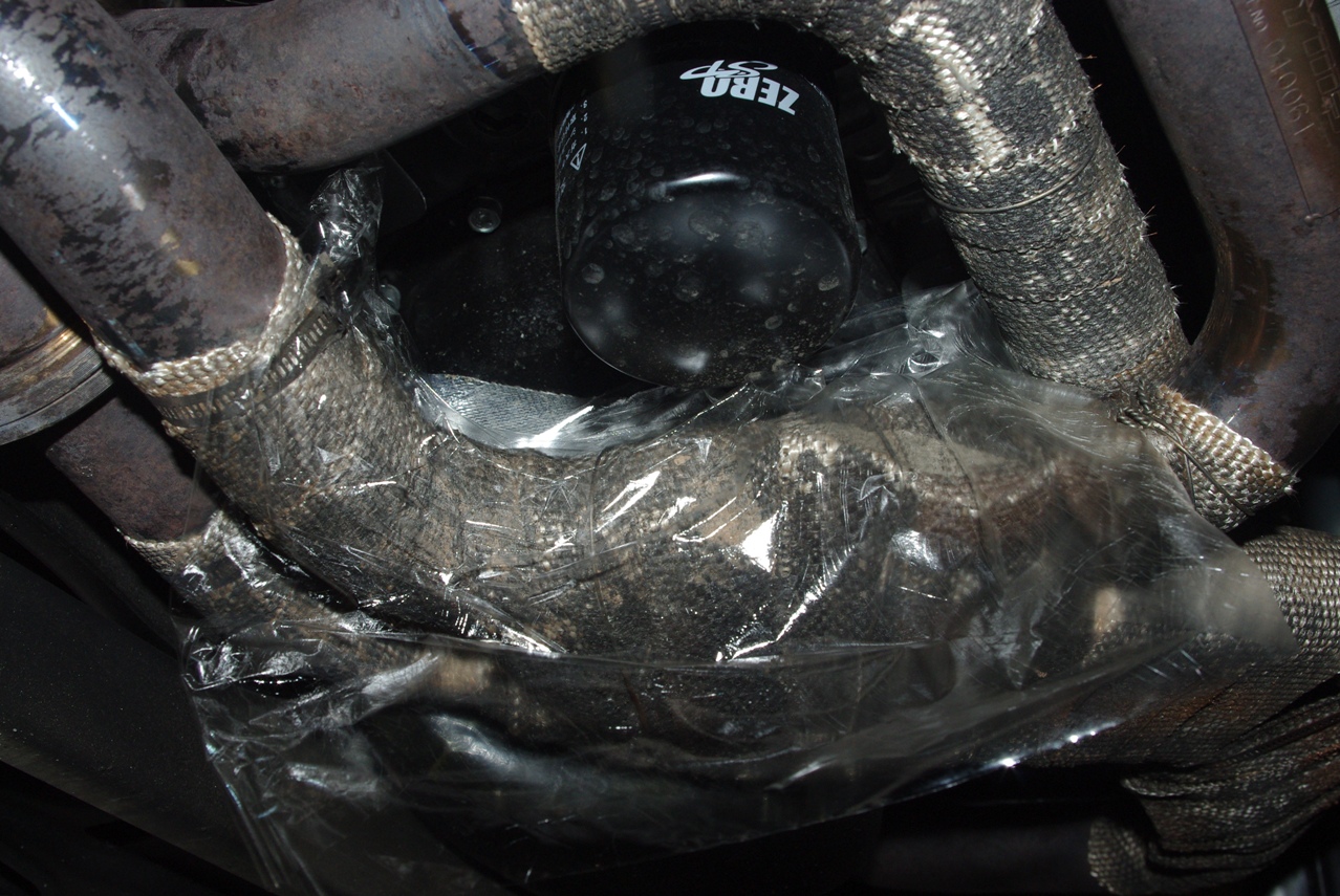 まずエレメント周囲のEXマニを、ラップで覆ってオイルが掛からないように保護します。