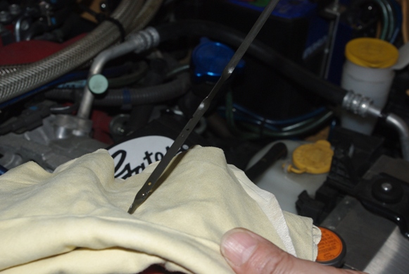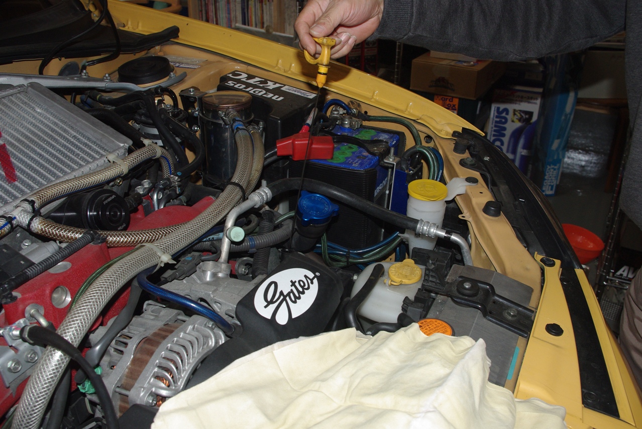 3.5リットルほど給油した後、エンジンを掛けてオイルを温めてからレベルゲージで量を計ります。
