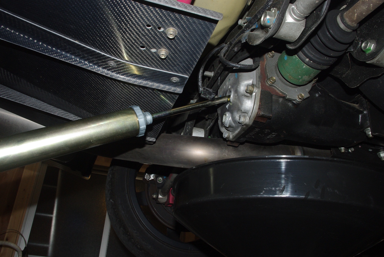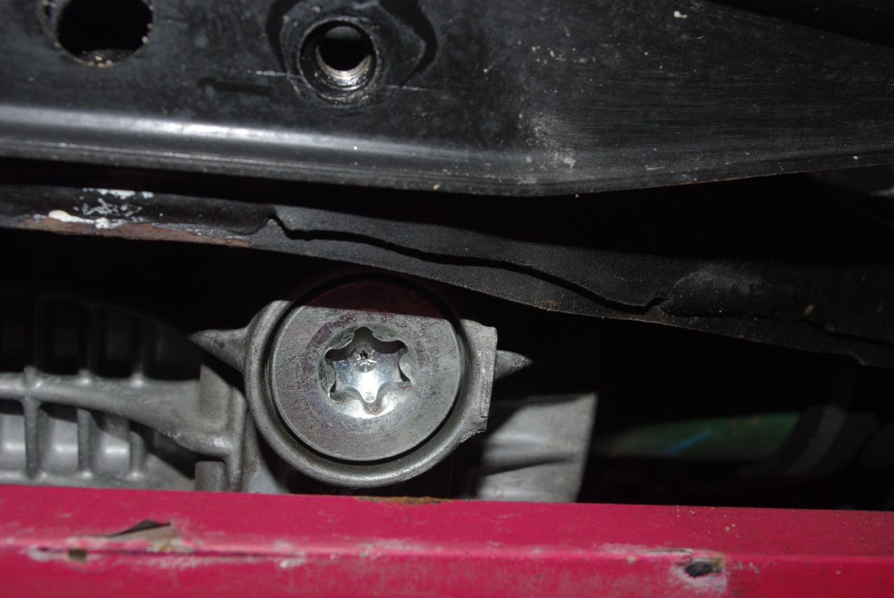 若干STIロアアームバーがトルクスの軸線上に掛かって邪魔ですが、少し軸線が傾く程度でこれまでロアアームバーは取り外したことは無いので、そのままレンチで緩めます。